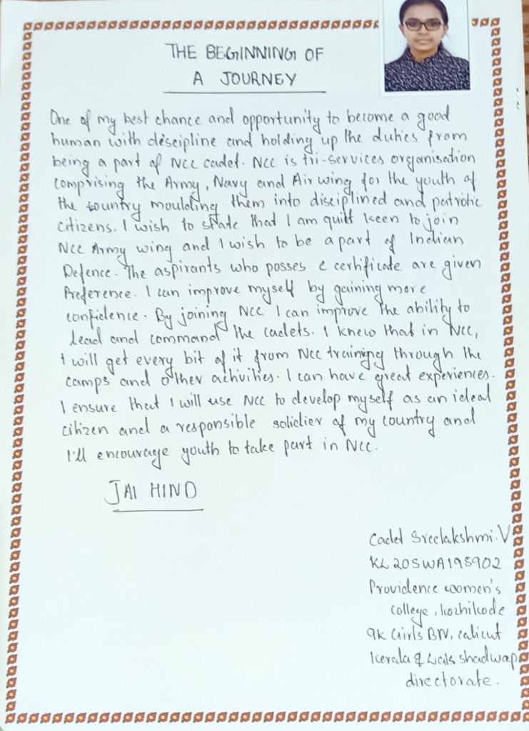 I am NCC cadet Lekhank Chandrakar , I like drawing , writing , reading and doing physical exercise . I joined NCC to improve my communication skills, sincerity, patience , discipline and to be physically as well mentally strong .