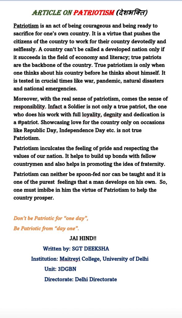 This is a small article on Patriotism written by SGT Deeksha so as to enhace more knowledge about patriotism & its importance in one's heart & mind. Hope you all like it! And will be patriotic and dedicated to each & every good deeds.
