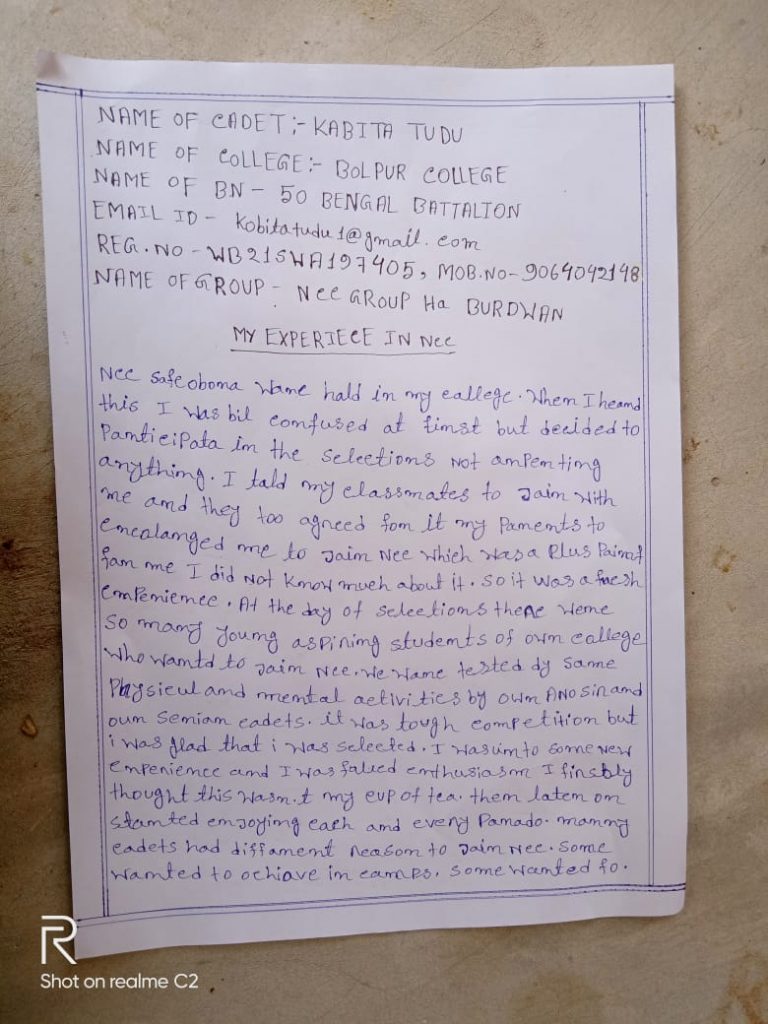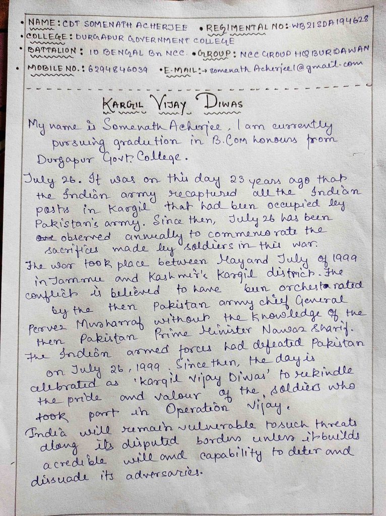 Name- Somenath Acherjee Reg. no. - WB21SDA194628. Rank- Cadet College- Durgapur Government College Battalion- 10 Bengal Bn NCC, Asansol Group- Burdawan HQ group Directorate- WB & Sikkim Dte.