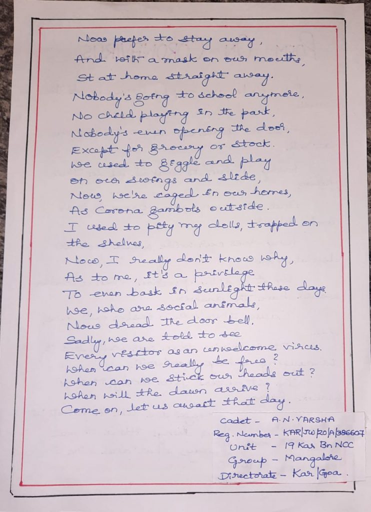 Jai Hind! My name is Manvi from 1HP AIR SQN. NCC KULLU with regimental no.HP20/SWF-309560