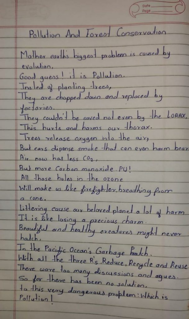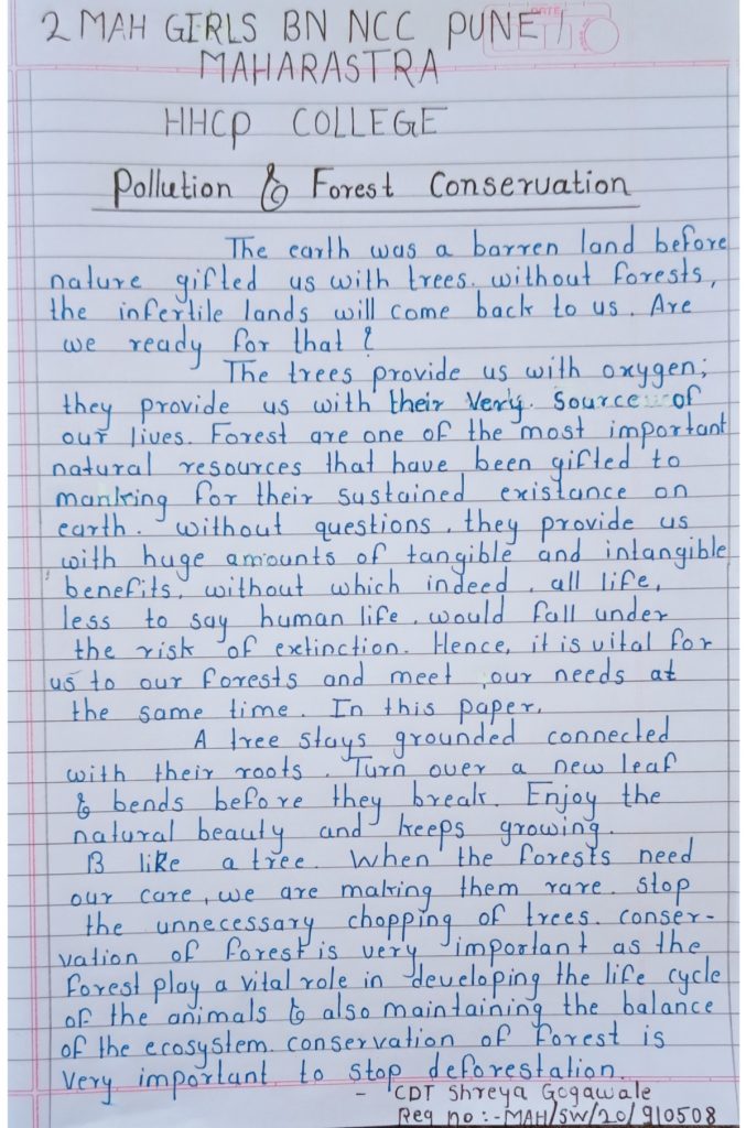 Am CDT Shreya Dattatray Gogawale from HHCP collage unit 2 Mah girls BN NCC PUNE maharastra done to this activity pollution and forest conservation essay ( save forest and forest will save you)
