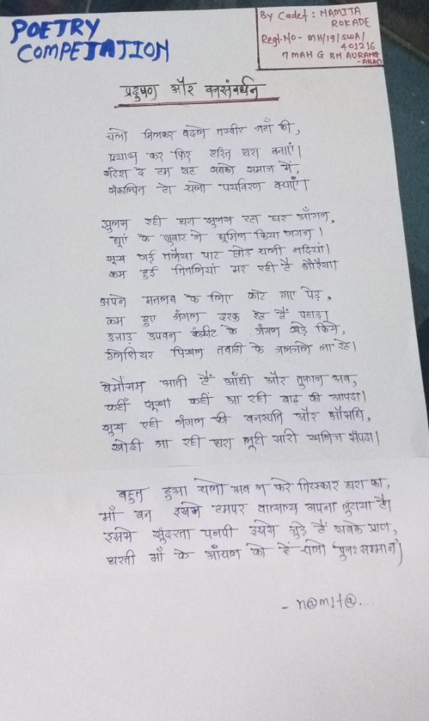 POETRY COMPETITION:POLLUTION & FOREST CONSERVATION ON THE OCCASION OF INDEPENDENCE DAY BY CADET NAMITA SANTOSH ROKADE,7Mah G BN AURANGABAD, Regt.No.:MH/19/SWA/401216 (My Own Poem)✍️✍️