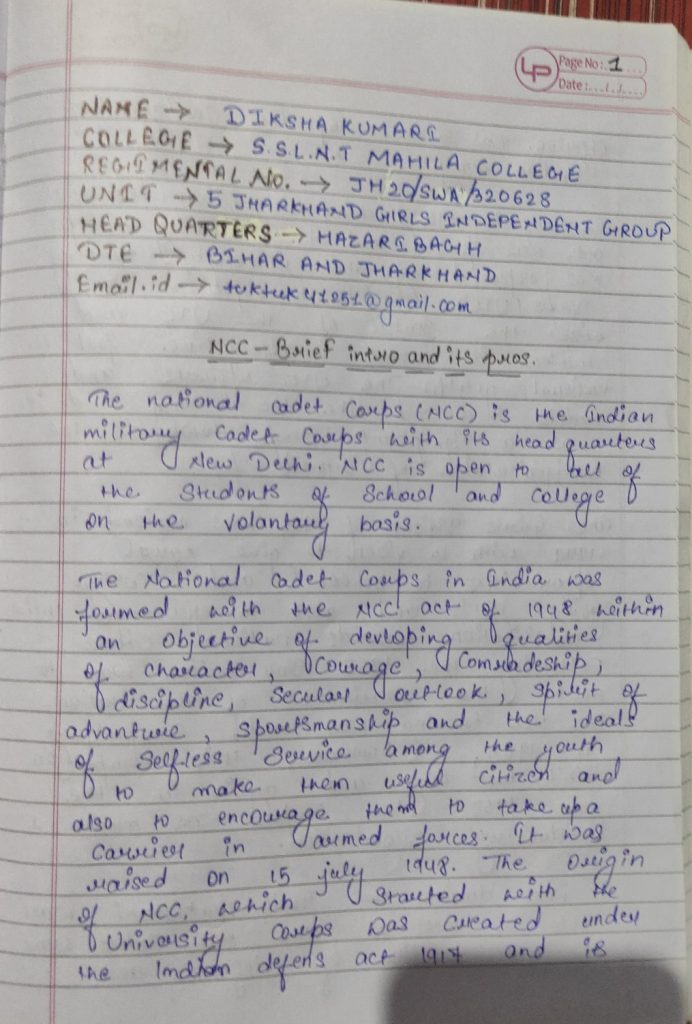 NAME - DIKSHA KUMARI COLLEGE - SSLNT , MAHILA COLLEGE REGIMENTAL NO. JH20/SWA/320628 UNIT - 5 JHARKHAND GIRLS INDIPENDENT GROUP HWAD QUARTERS - HAZARIBAGH DTE - BIHAR&JHARKHAND EMAIL ID - tuktuk41241@gmail.com