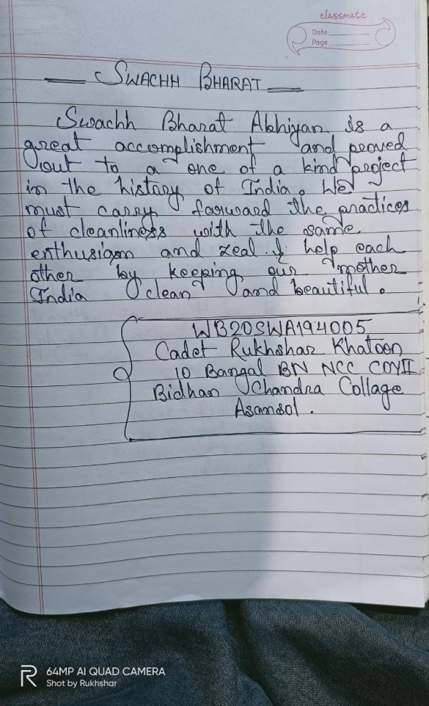 Name-Cadet Rukhshar Khatoon Reg.no-WB20SWA194005 10 Bangal BN NCC COYll Bidhan Chandra Collage Asansol