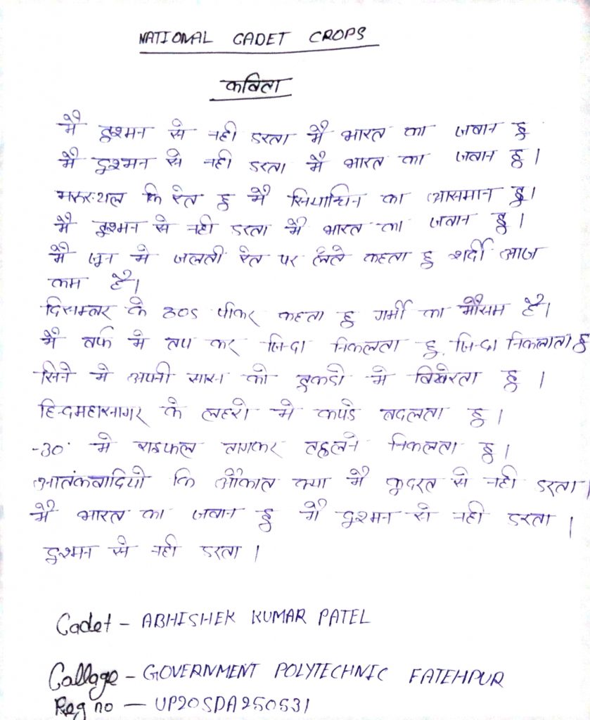 Sajad Choudhary Jk/21/SDA/930046 from 2nd J&K (I) Coy NCC GDC Bhaderwah