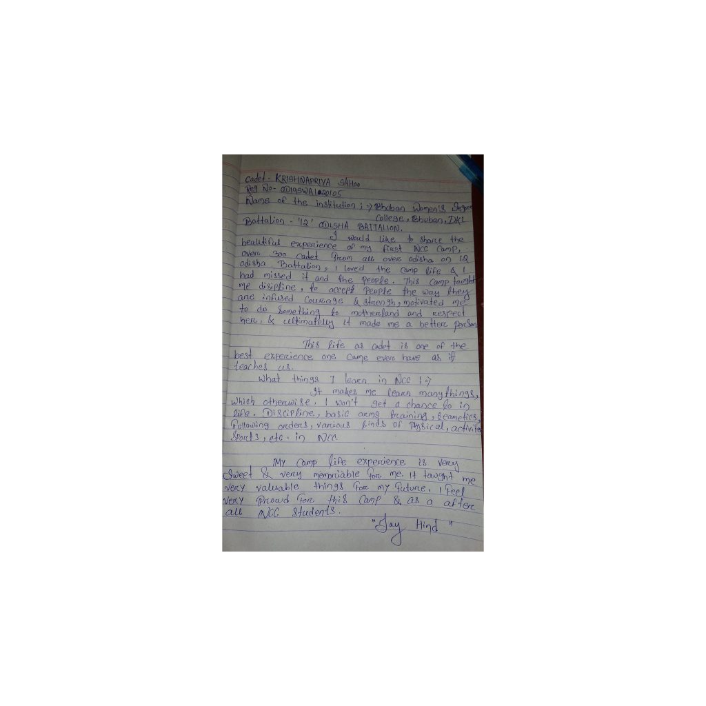 My self krishnapriya sah I am a cadet of Bhuban women\'s degree college UNDER 12 ODISHA BATTALION My regiment no_OD19SWA120105 I AM VERY PROUD AS A NCC CADET I SUBMIT MY LOVELY AND SWEETEST 1ST NCC CAMP EXPERIENCE