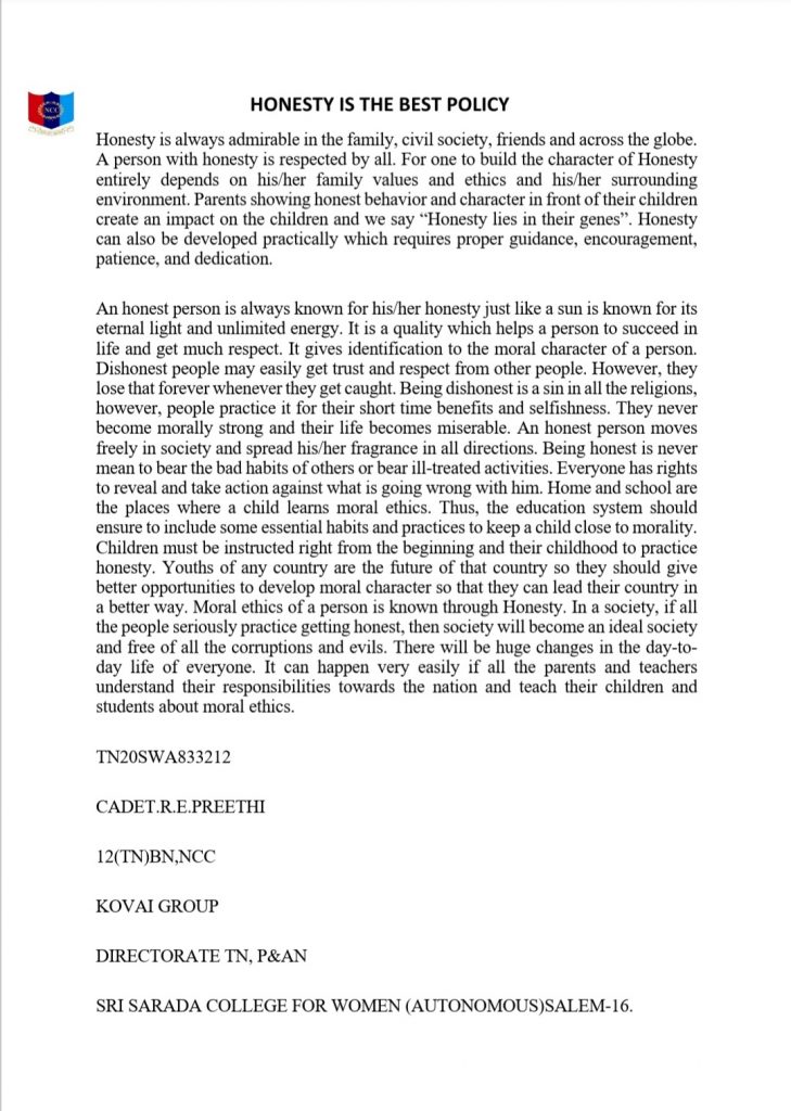CADET.R.E.PREETHI TN20SWA833212 SRI SARADA COLLEGE FOR WOMEN (AUTONOMOUS)SALEM-16. 12(TN)BN NCC, KOVAI GROUP, TN,P& AN DTE.
