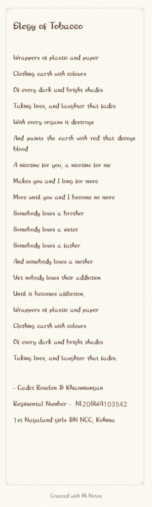 I am cadet Roselen B Khiamniungan regt.no. NL/20/SWA/103542 from Kohima, Nagaland. I wrote a poem for the World No Tobacco Day that is on May 31,2021 May 30 2021