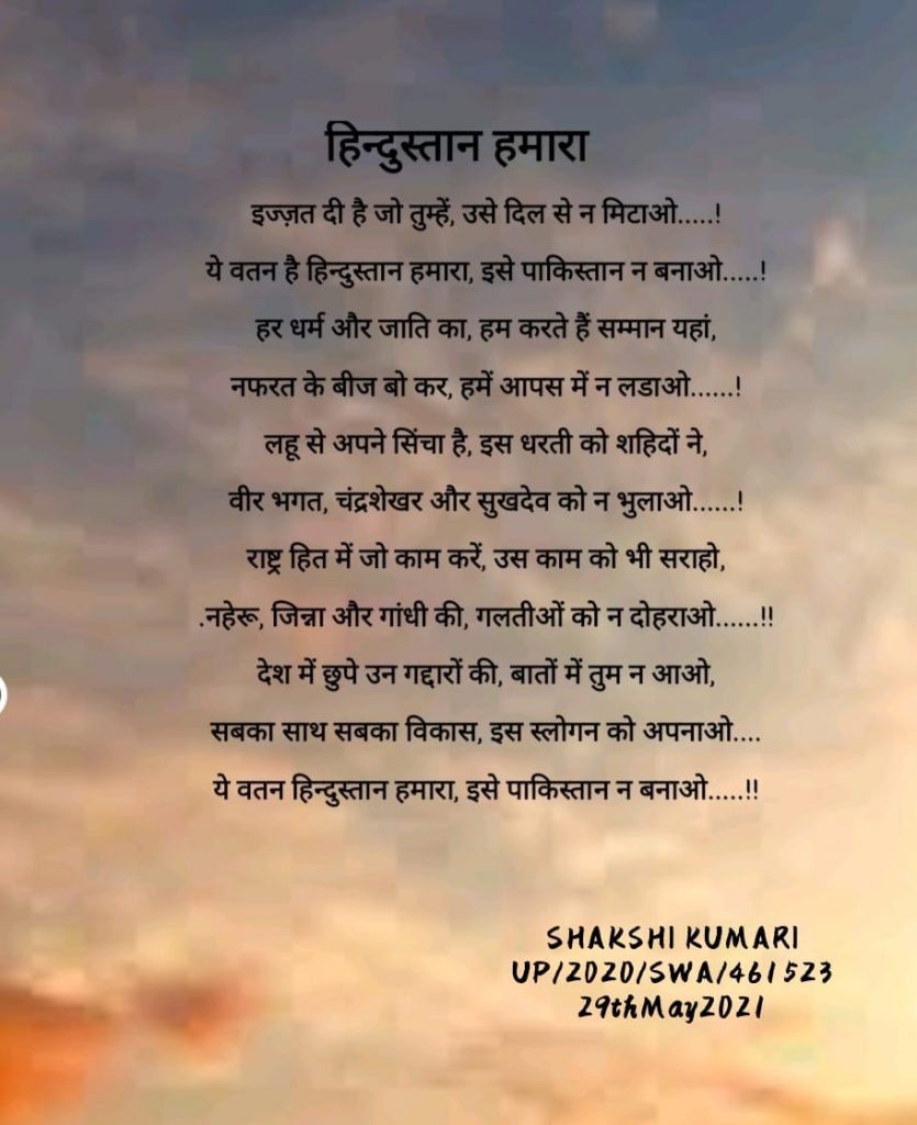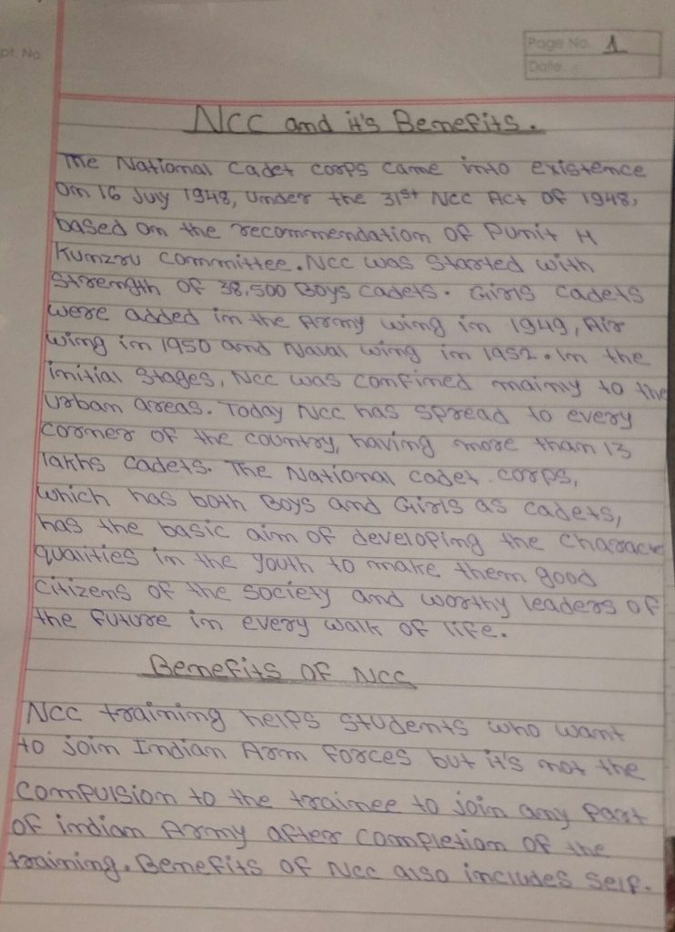 I cadet Sakshi Rajput from 1 j&k naval unit ncc srinagar . I wrote about my experience of swachh bharat. And I love to play games like volleyball and cricket. I'm a introvert. I didn't indulge in messy things.