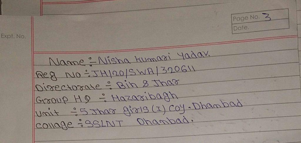 Name=Nisha kumari yadav Reg no= JH/20/SWA320611 Directorate= Bih $ Jhar HQ= Hazaribagh Unit= 5jhargirls (I) could. Dhanbad Collage= sslnt college Dhanbad