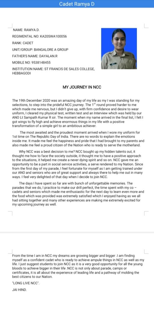 Name : Ramya.D Rank. : Cadet Regiment no : KA20SWA100056 Unit. : 1 KAR BAN NCC Group : Bangalore A group Institution : St Francis de sales college, hebbagodi