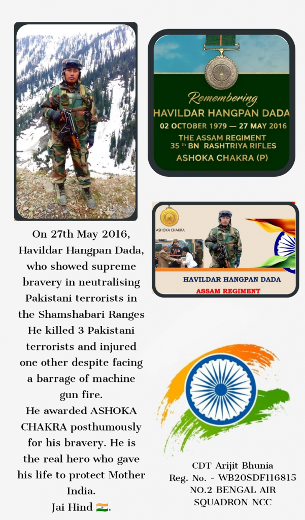 On 27th May 2016, Havildar Hangpan Dada, who showed supreme bravery in neutralising Pakistani terrorists in the Shamshabari Ranges.