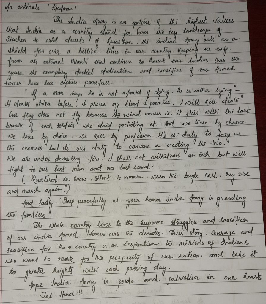“I would like to share the beautiful experience, Our day started with lectures were given by military officers on Character building, Personality Development, Career counseling, drill training, Gun introduction,Map reading, Thanking you .