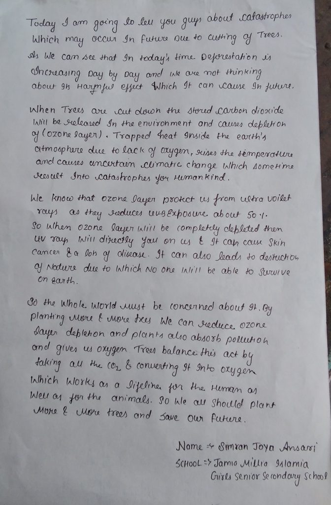 I am simran joya ansari of standard 9 studying in (Jamia millia islamia girls senior secondary school). I had written about tree plantation.how iportant is it? And how much devastation cutting of trees can cause.