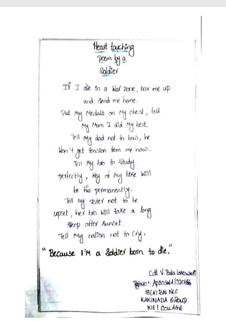 Cdt V.Bala Lokeswari Rgt no: AP20SWA /320166 My Topic : Heart touching poem by a solider
