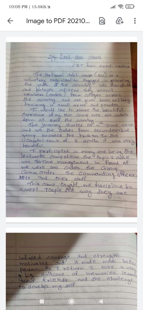 Cadet Manisha Rath Regimental no. - OD/19/SW/A 304-340. Class - +3 2nd yr, Botany This was my first experience of EBSB VII Camp. I am uploading my experience of this camp.