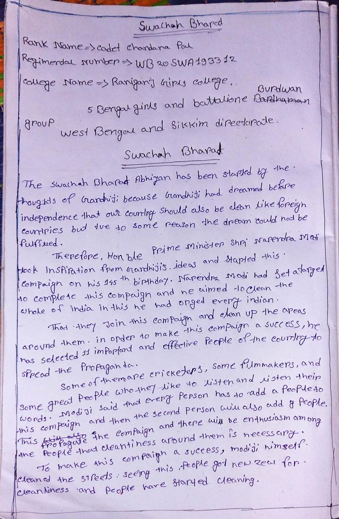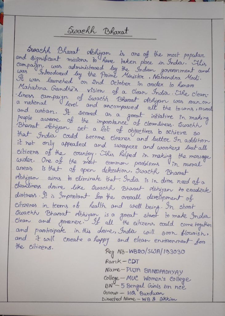 Activity -Swachh Bharat Abhiyan Essey Name- Puja Bandopadhyay Reg No- WB20SWA193030 College Name- MUC Women's College BN Name- 5 Bengal Girls Bn NCC Group Name- HQ Burdwan Directed Name- WB and Sikkim