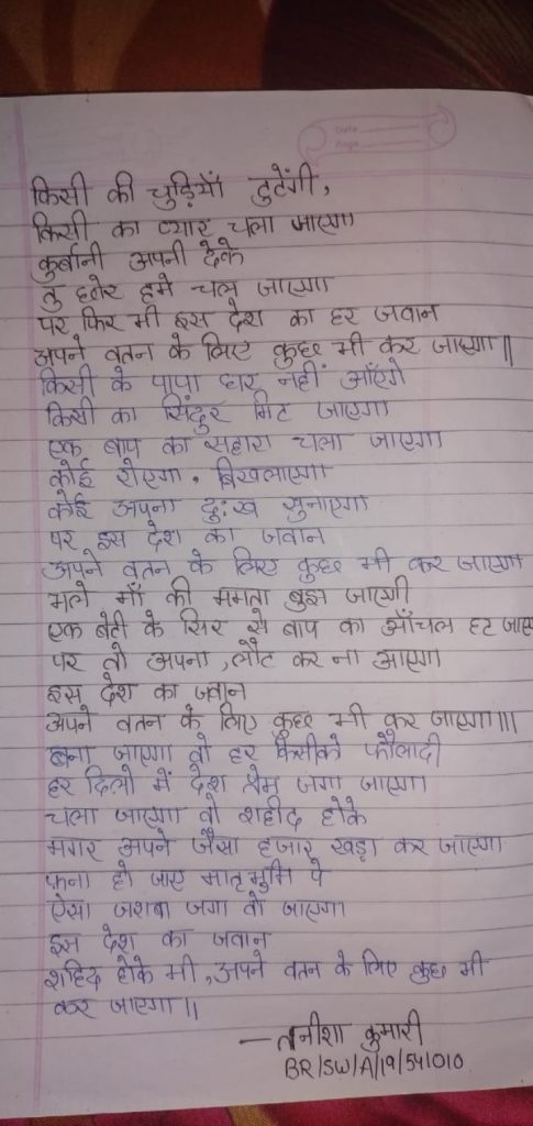 Tanisha kumari Rank-cadet Patna Group BR/SW/A/19/541010 1st Girls Battalion BN NCC