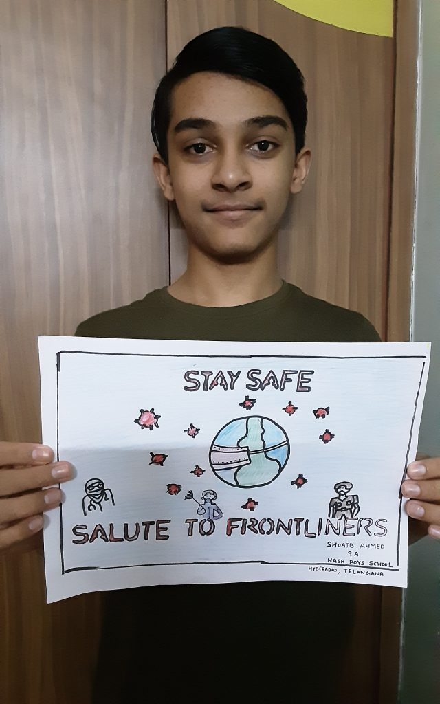 Shoaib Ahmed of Nasr Boys school, Hyderabad made a poster on Covid-19 and want to convey the message to everyone to be safe and want to salute the front-liners who are fighting with covid-19.Thank you for your service to the nation.