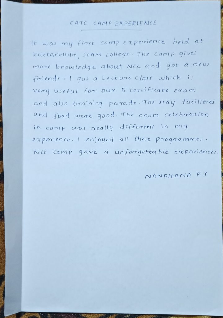 CDT NUMBER : KL21SWA266341 NAME : CDT NANDHANA P S INSTITUTION : SREEKRISHNA COLLEGE, GURUVAYUR COMPANY : 5TH COY BN : 23(K)BN, NCC THRISSUR
