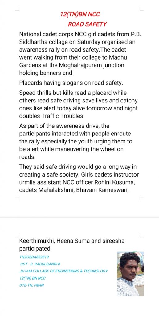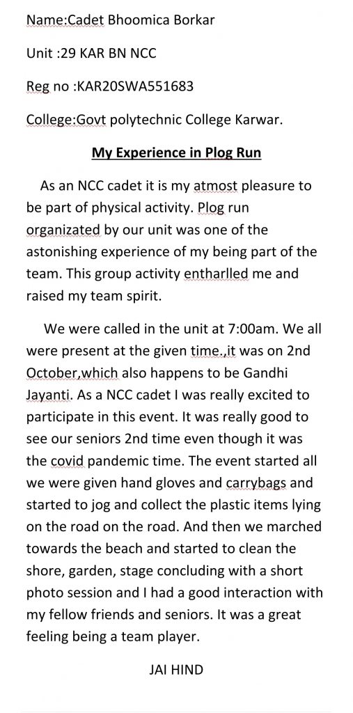 Name:Cadet Bhoomica Borkar Unit :29 KAR BN NCC Reg no :KAR20SWA551683 College:Govt polytechnic college karwar