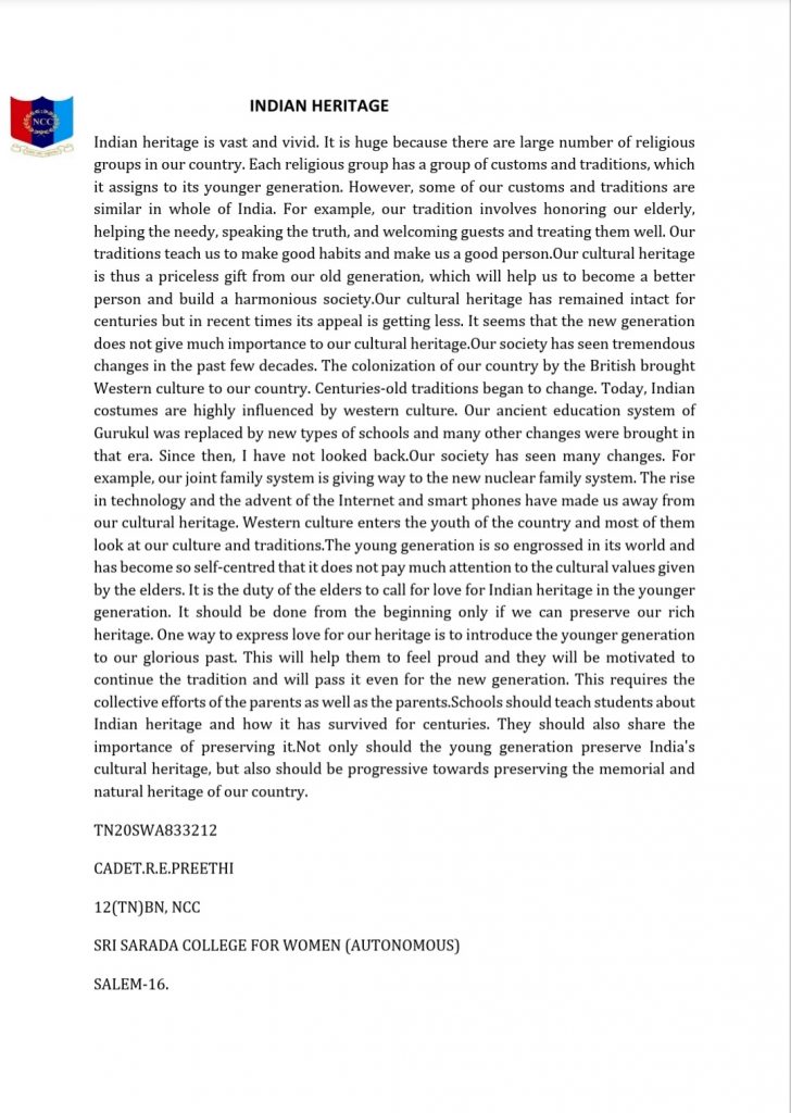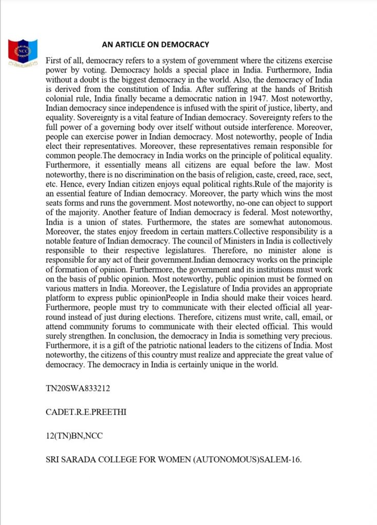 TN20SWA833214 , Cdt.N.Subhashri , 12(TN)BN ,NCC , Sri Sarada College For Women (Autonomous) , Salem – 16 .