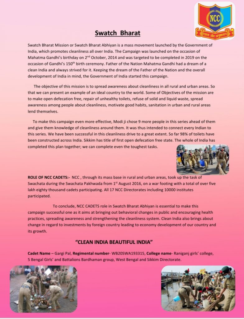 Topic- Swatch Bharat Cadet Name- Gargi Pal Regimental number- WB20SWA193315 College name- Raniganj girls college 5 bengal girls abd battalion and bardhaman group, West Bengal and Sikkim directorate.