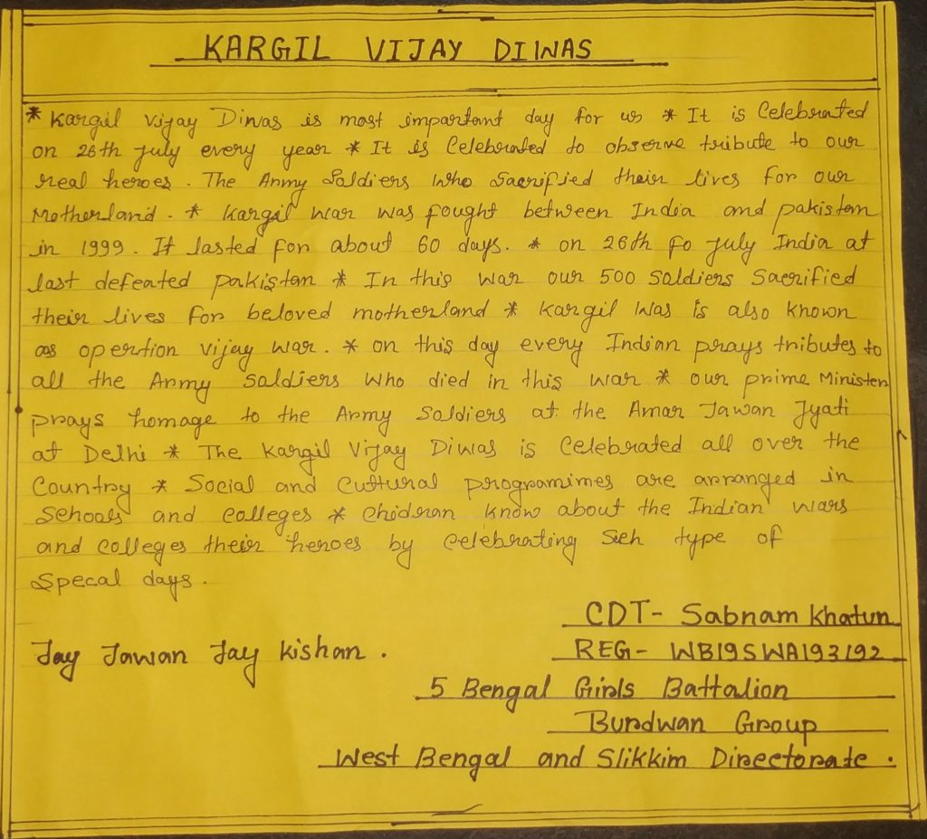 WB19SWA193192 Rank-cadet Name -Sabnam khatun College- Durgapur women's College Unit-5 Bengal girls Battalion Burdwan Group West Bengal and Sikkim Directorate.