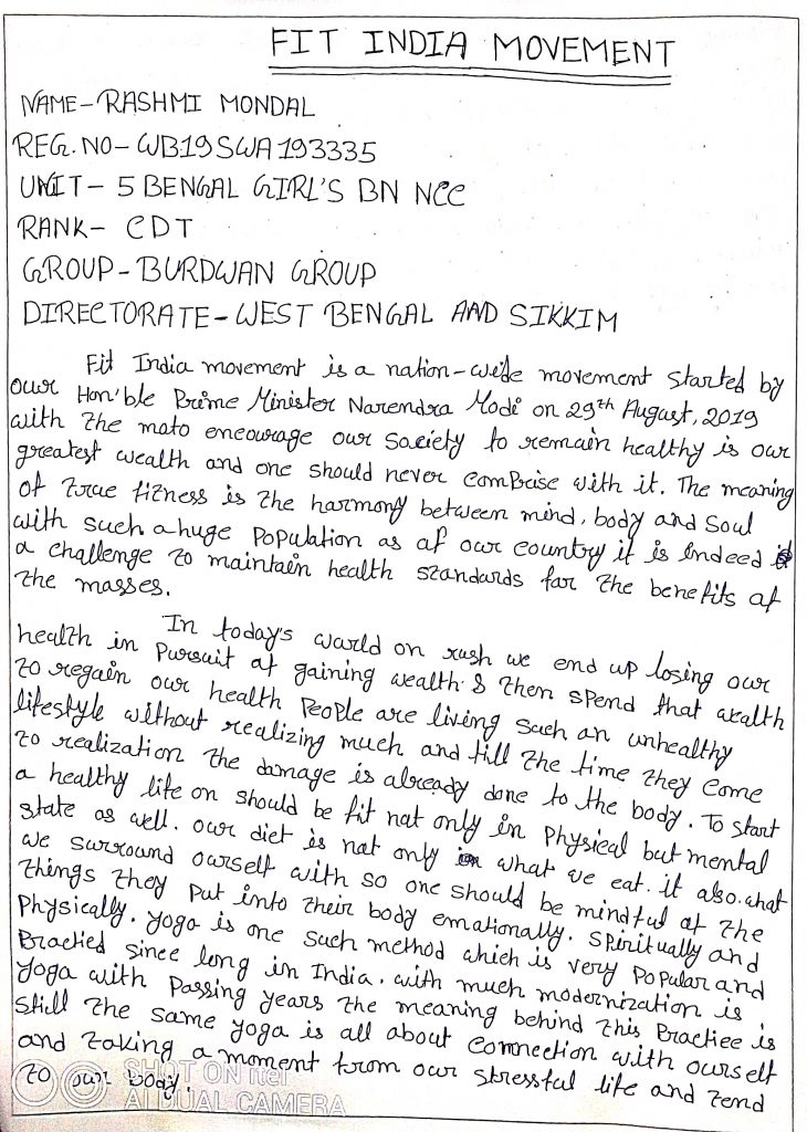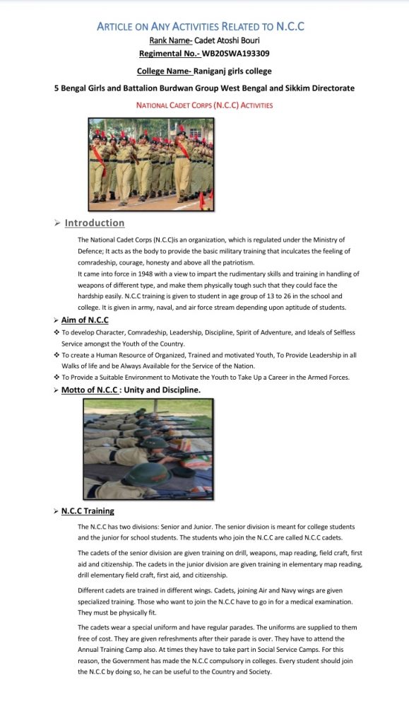Rank Name-Cadet Atoshi Bouri Regimental no-WB20SWA193309 College Name-Raniganj girls college 5 Bengal Girls and Battalion Burdwan Group West Bengal and Sikkim Directorate