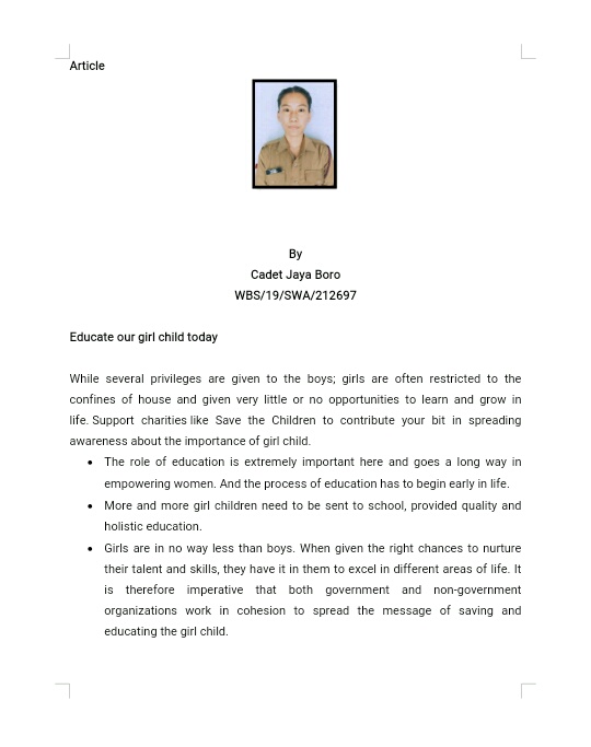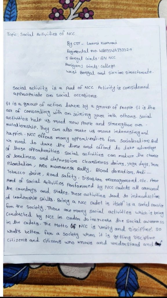 This is article written by WBS/19/SWA/212697 cadet jaya boro institute of saheed kshudiram college. She is a student of physical education and has been taken actions interested in all Ncc activities . Her hobby is dancing and sports