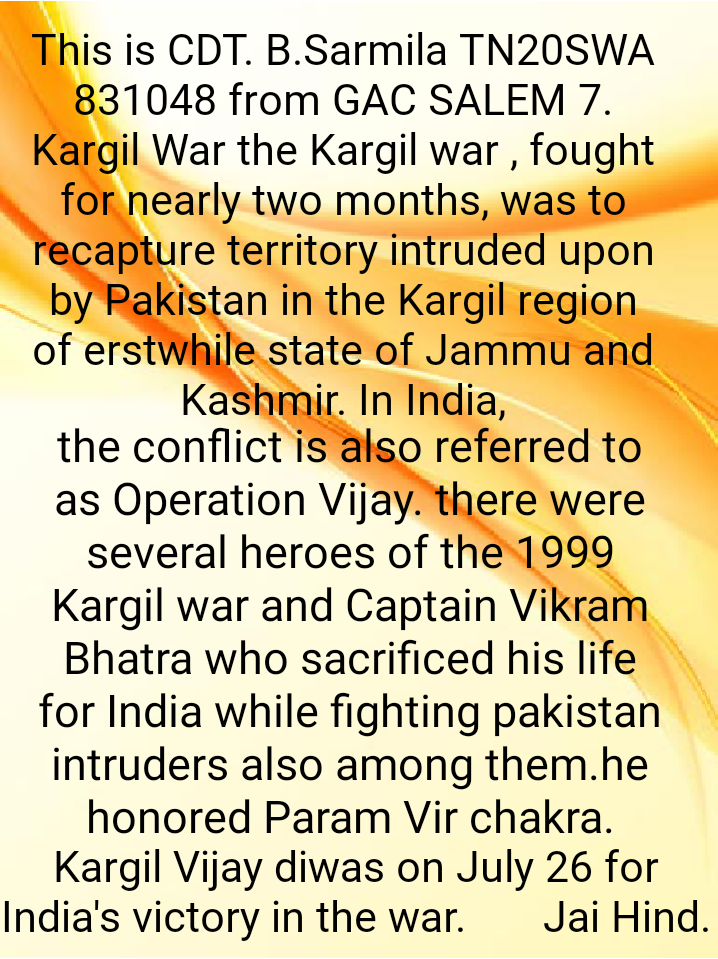 CDT. B.Sarmila TN20SWA 831048 GAC, SALEM 7 1/12TN BN NCC Coimbatore group Tamilnadu Pondicherry Andaman Directorate Tamilnadu