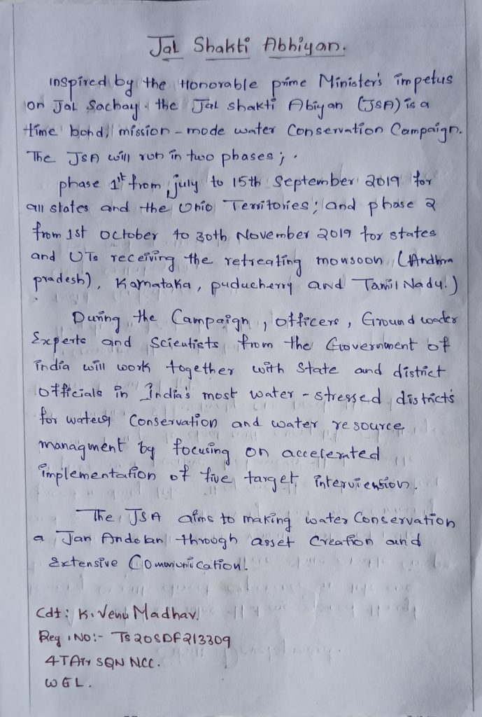 Inspired by the Hon’ble Prime Minister’s impetus on Jal Sanchay, the Jal Shakti Abhiyan (JSA) is a time-bound, mission-mode water conservation campaign