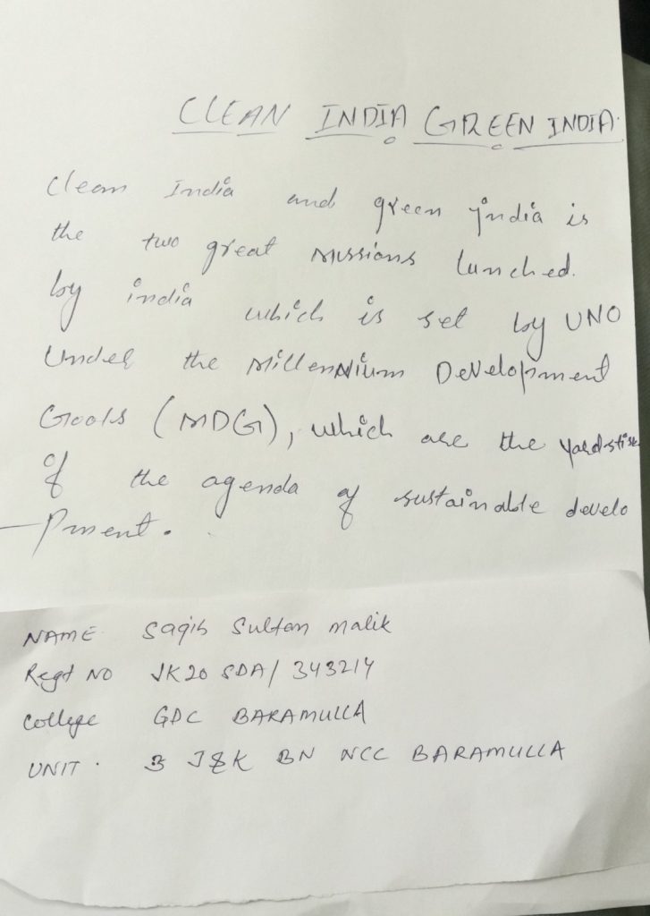 Name saqib sultan malik Reg No Jk 20 SDA/343214 College GDC baramulla Unit 3 jk BN Ncc baramulla