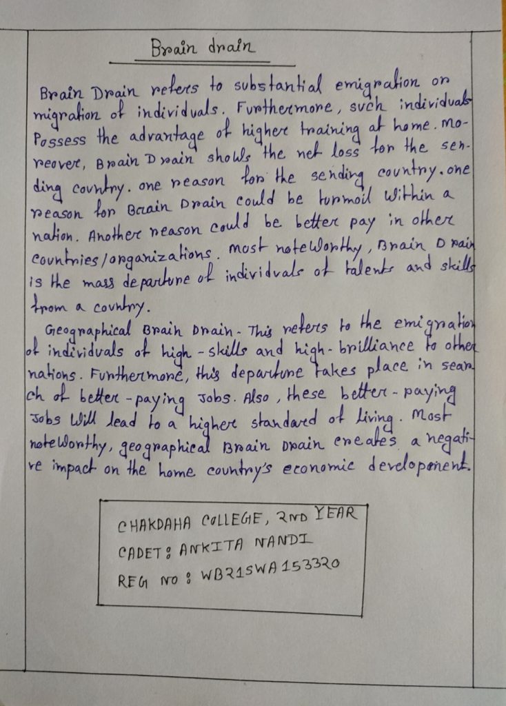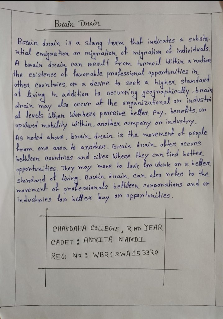 I am Ankita Nandi, Reg Number: WB21SWA153320, writing about Brain drain.