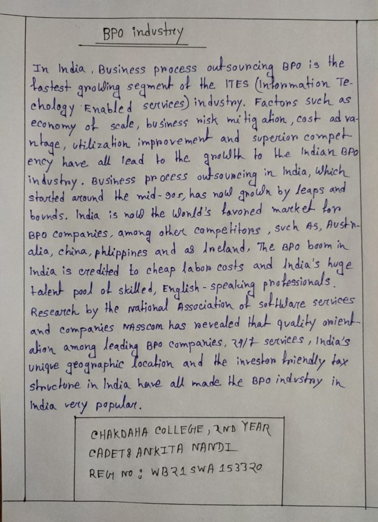 I am Ankita Nandi, Reg Number: WB21SWA153320, writing about BPO Industry.