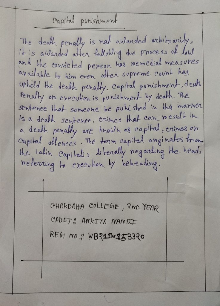 I am Ankita Nandi, Reg Number: WB21SWA153320, writing about Capital punishment.