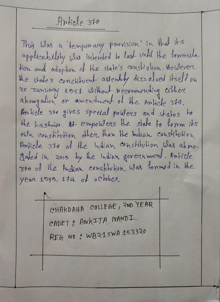 I am Ankita Nandi, Reg Number: WB21SWA153320, writing about Article 370.