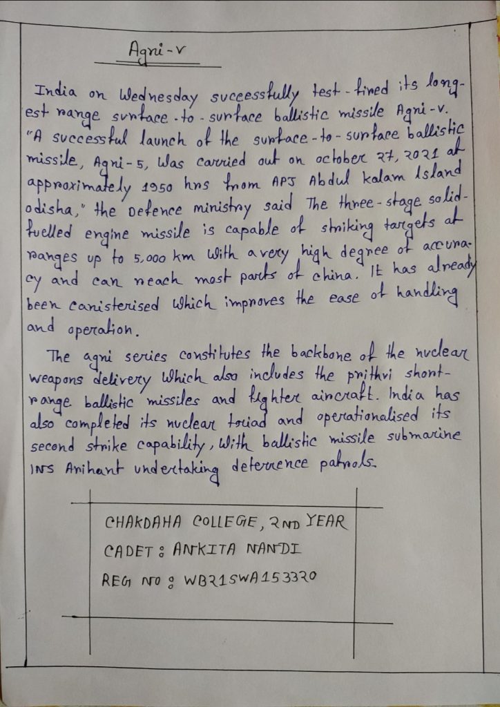 I am Ankita Nandi, Reg Number: WB21SWA153320, writing about Agni V.