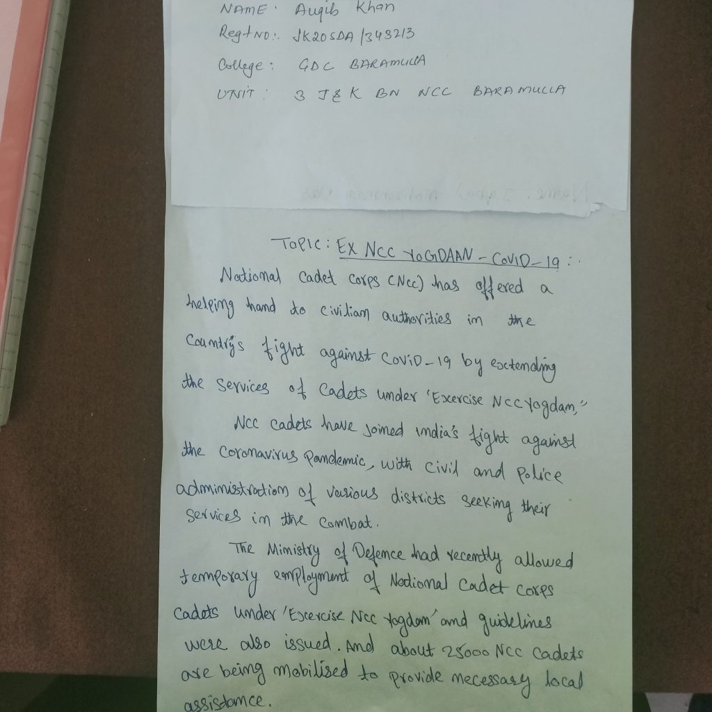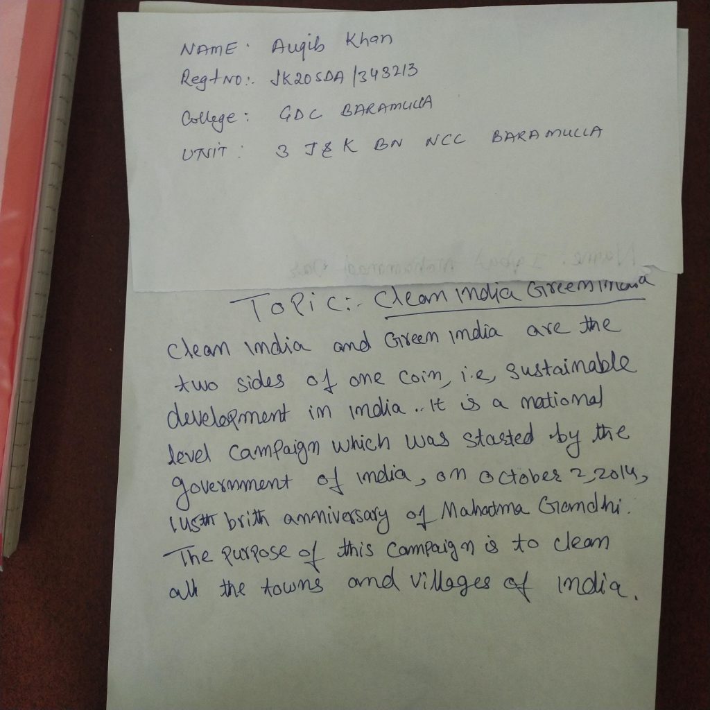 Name Auqib khan Reg No Jk20SDA /343213 College GDc baramulla Unit 3j&k BN NCC Baramulla