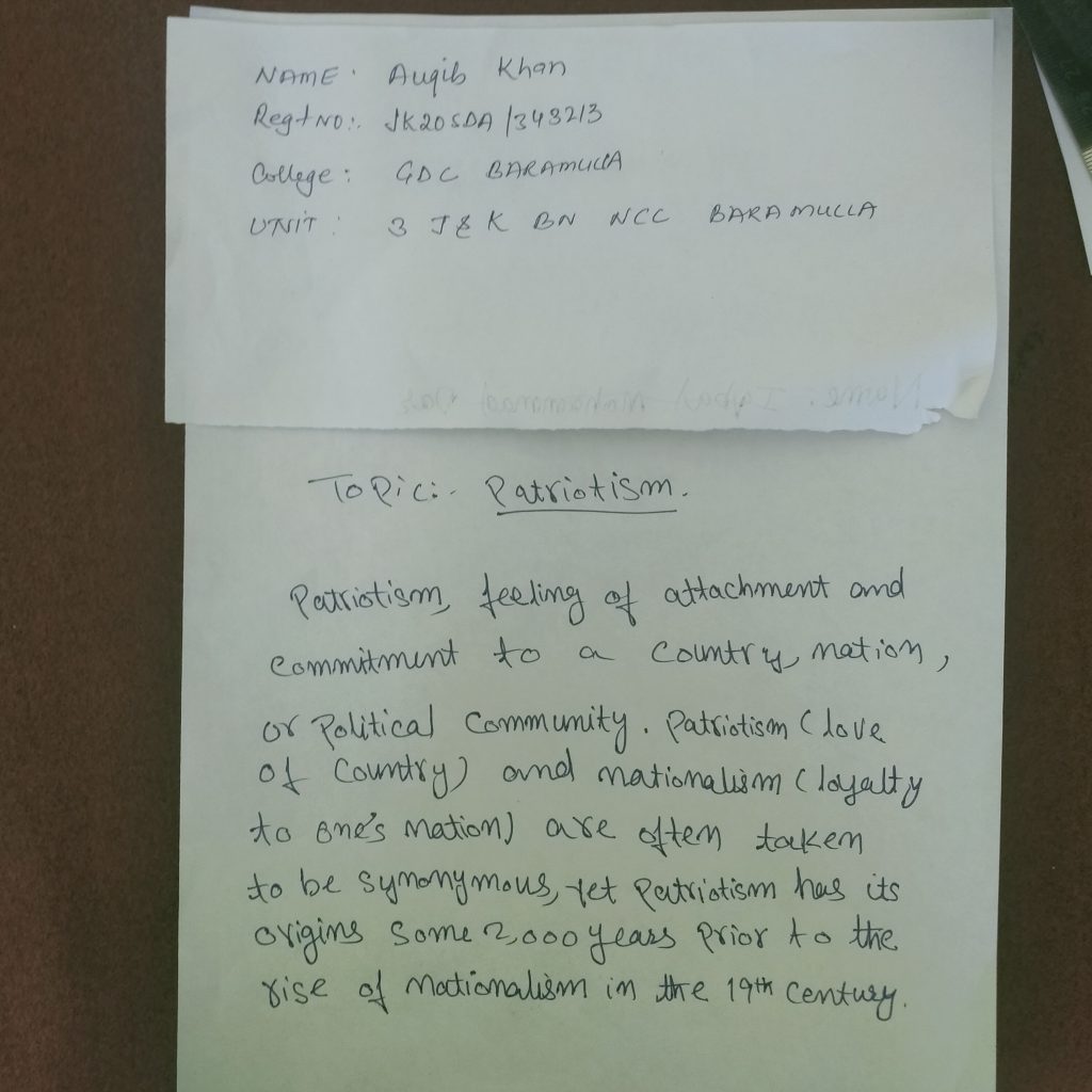 Name Auqib khan Reg No Jk20SDA /343213 College GDc baramulla Unit 3j&k BN NCC Baramulla
