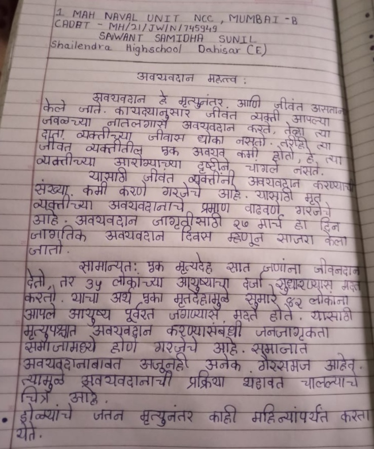 1/ MAH/ 20/ SW/ N /714445.CDT VEDASHREE PRAVEEN THAKUR. Institution- BHONSALA MILITARY COLLEGE