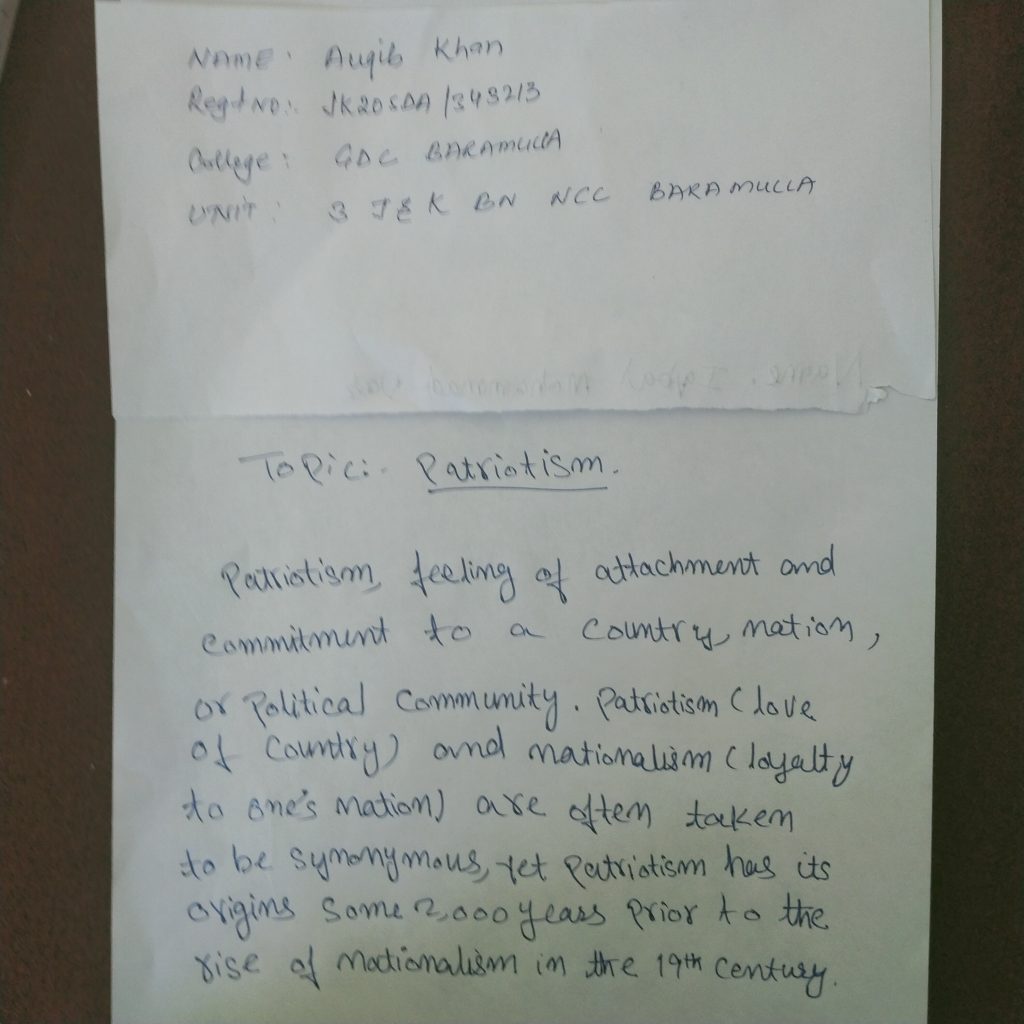 Name Auqib khan Reg No Jk20SDA /343213 College GDc baramulla Unit 3j&k BN NCC Baramulla