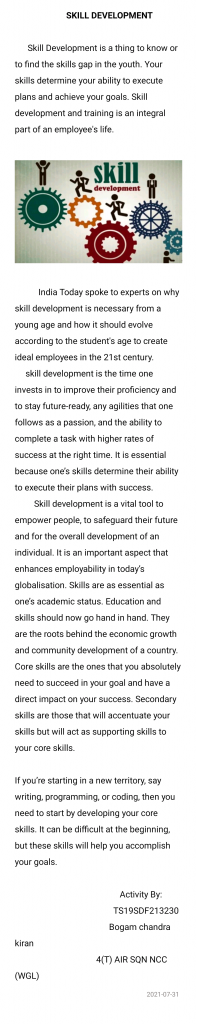 SkILL DEVELOPMENT:- Skill Development is the process of identification of the skills gap in youth and providing skilling training & employment benefits to them. ... Education and skills are essential for everyone, and they both walk hand in hand .