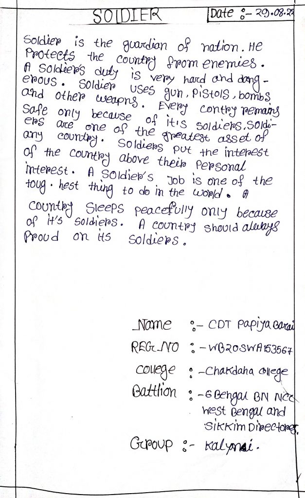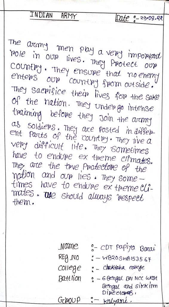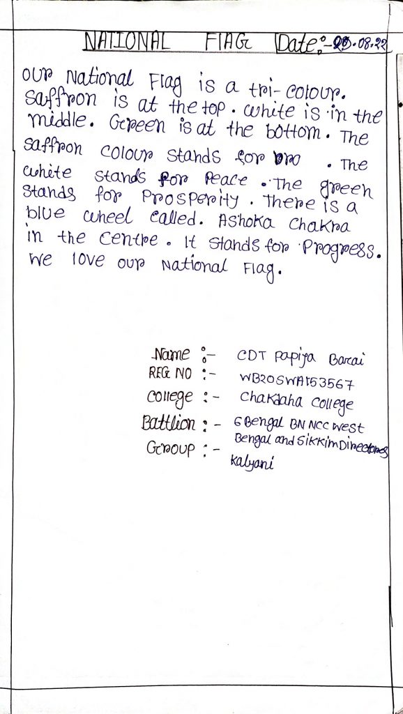 Name :- CDT Papiya Barai REG NO :- WB20SWA153567 COLLEGE NAME :- Chakdaha college Battalion :- 6 Bengal BN NCC West Bengal and Sikkim Director Group :- Kalyani Group
