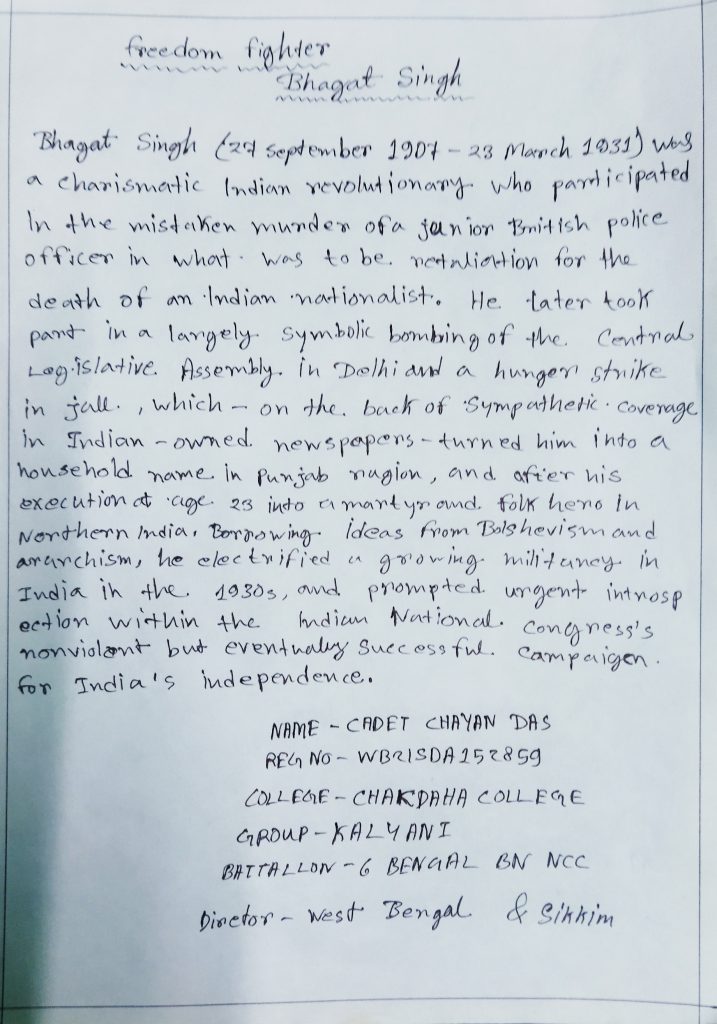 NAME-CADET CHAYAN DAS, REG.NO-WB21SDA152859, CHAKDAHA COLLEGE,6 BENGAL BN NCC, WB&SIK