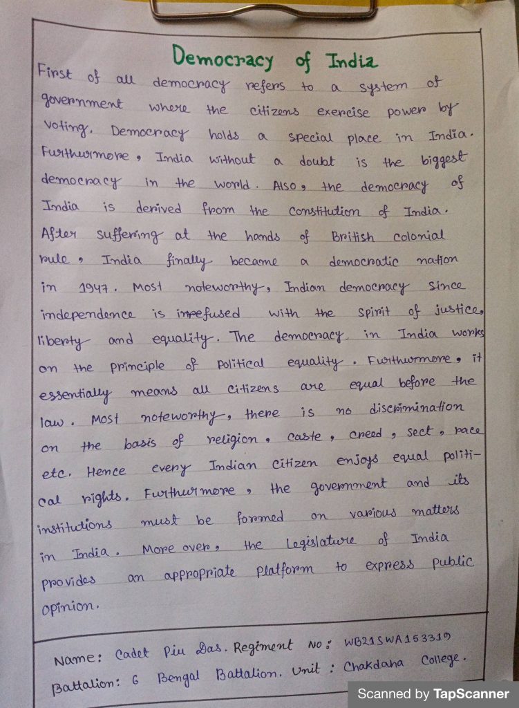 Name: Cadet Piu Das Regiment no:WB21SWA153319 Battalion:6 Bengal Battalion Unit: Chakdaha College