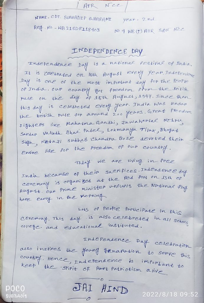 DIRECTORATE: WB&SIKKIM UNIT : NO 04 WB TECH AIR SQN NCC Name - Astuti Bhagat Regimental no -WB21SWF118418 INDEPENDENCE DAY POSTER