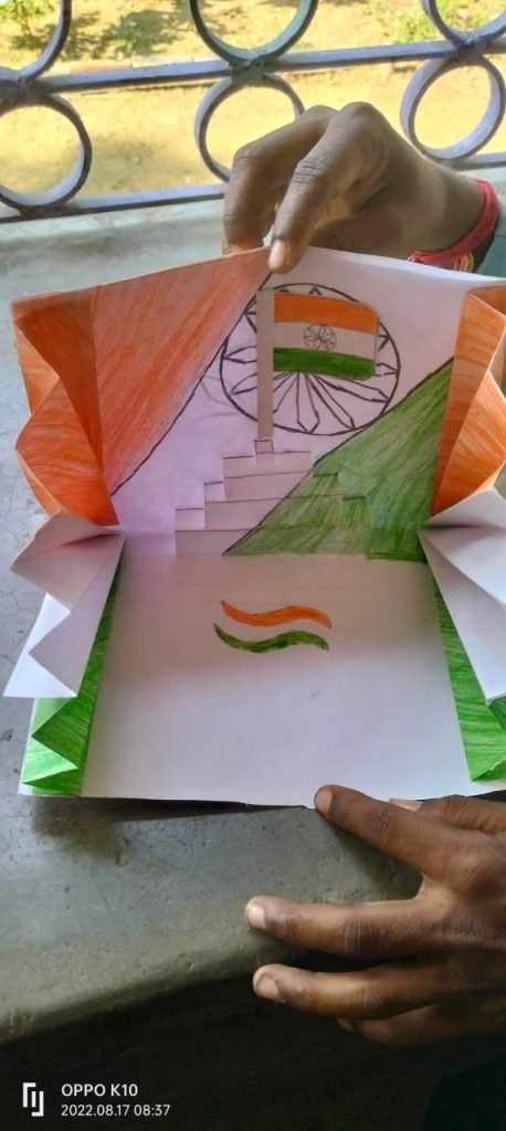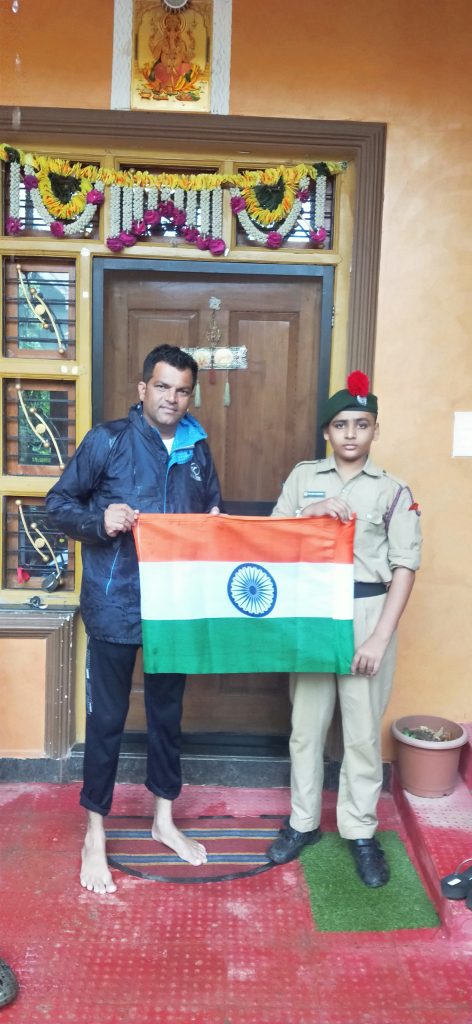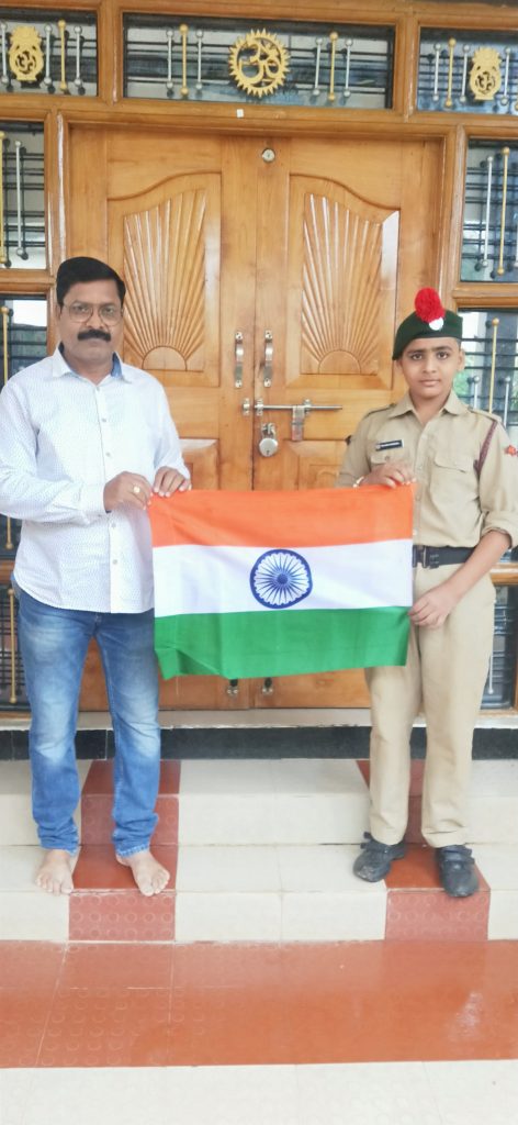 Palash khongal cadet of NCC in kendriya vidyalaya Balaghat distributing tirangas. And celebrating azadi ka Amrit mahotsav har Ghar tiranga