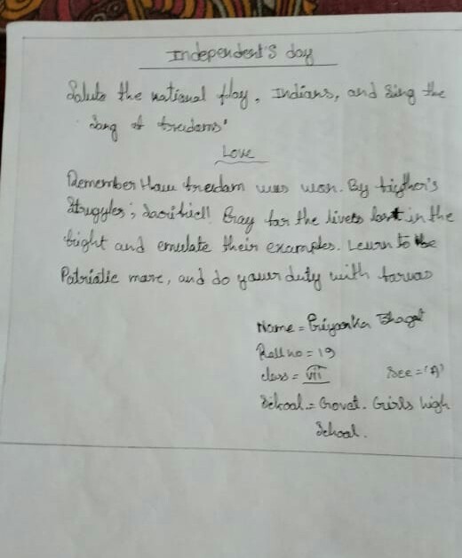 My name is priyanka Bhagat. I am 14 year old. My school name is government girl's high school. Above paragraph is about 75 years of our country's independens . Jayhind ,Bande Mataram. Bharat Mata ki Jay.