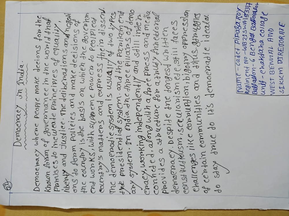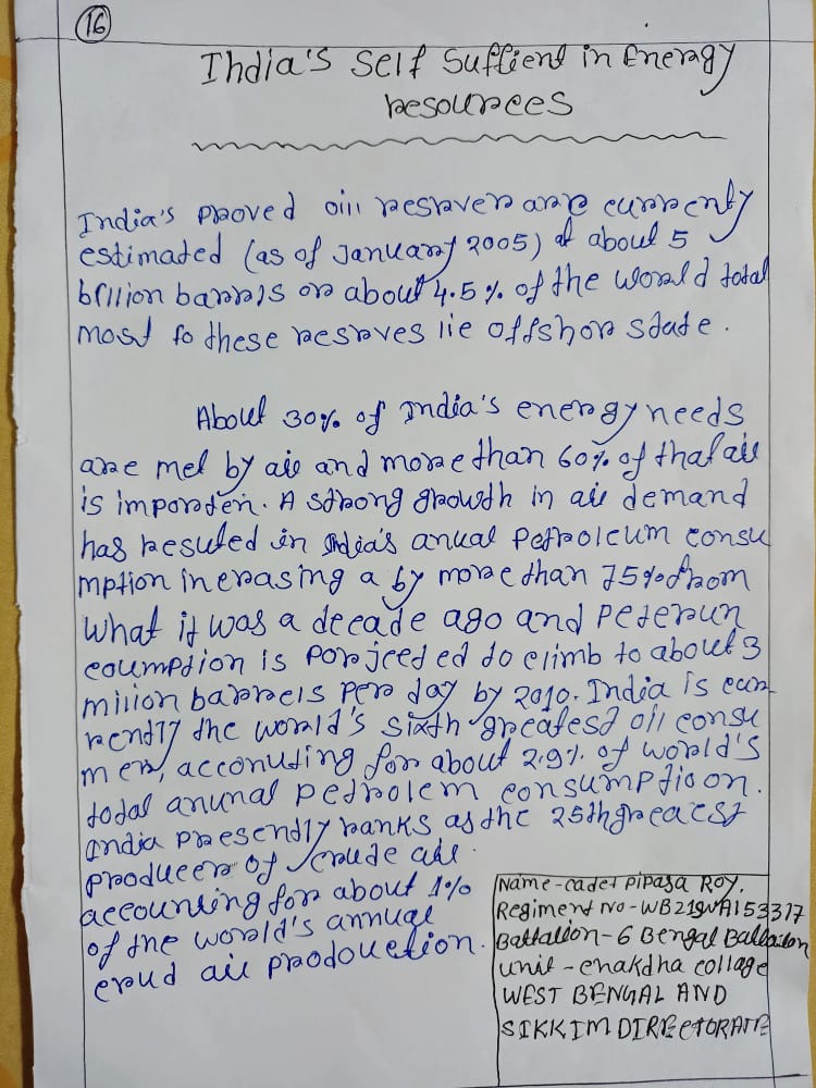 Name: Cadet Pipasa Roy Regiment no-WB21SWA153317 6 Bengal Battalion Unit- Chakdaha College